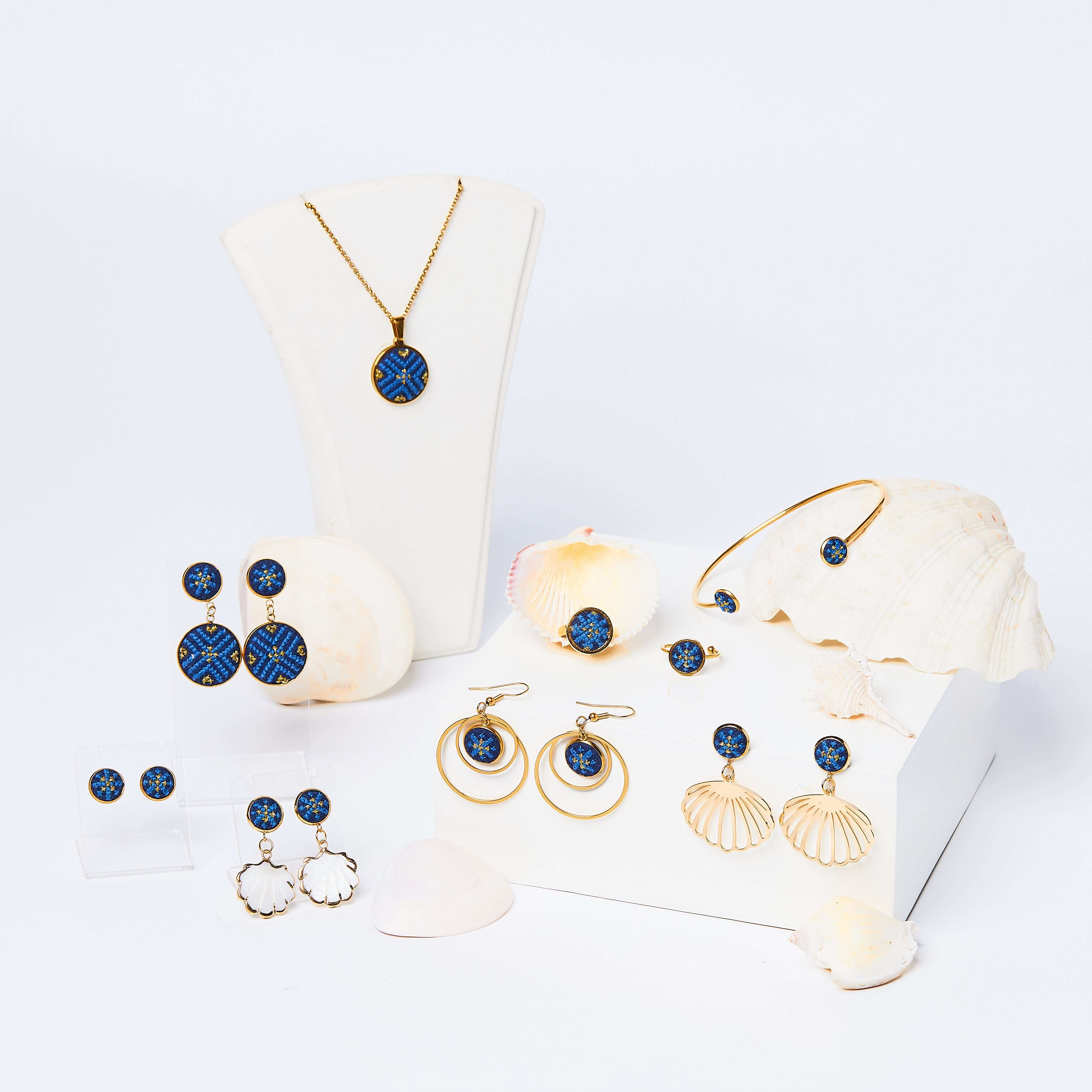 The patterns on the Oyster earrings have been hand-stitched with patterns inspired by motifs reminiscent of Middle-Eastern art and architecture, to honour the heritage of refugees from Afghanistan, Palestine, Syria and Iran, and the remote highlands of the Chin State, honouring refugees from Myanmar.